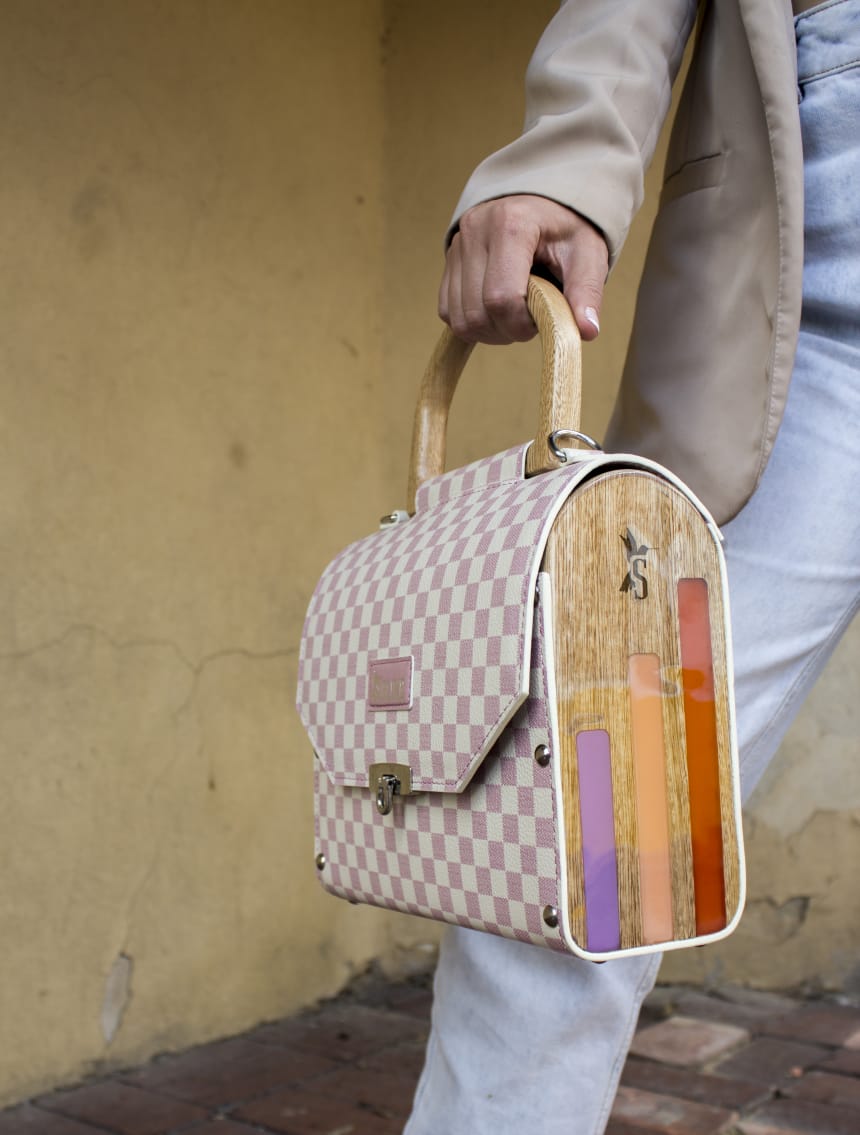 Our new and beautiful purse. Inspired to a new season of the year. Made with wood and leather. Leather painted and design by hand and an inside made of lining. Light weight and made for you daily items to carry. Comes with pocket with the size enough for your phone.